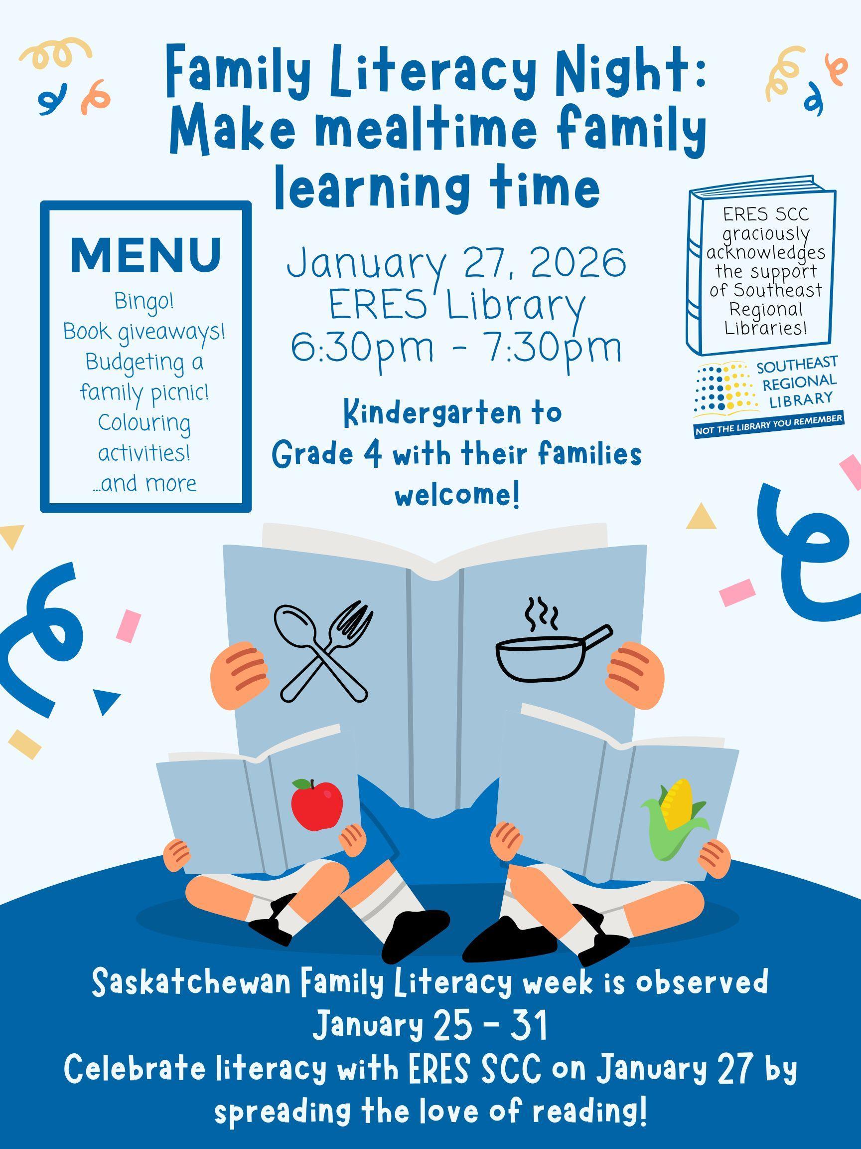 Family Literacy Night Attention Kindergarten to Grade 4 families Mark your calendars for a fun filled night held on by our SCC January 27th! All the details below & if you have any questions, please reach out to our SCC! Hope to see you all there!
